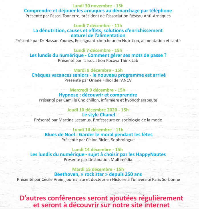 HappyVisio est une plateforme d’information en visioconférence, à destination des séniors. Une programmation de conférences et d'ateliers programmés est accessible gratuitement pour les participants.